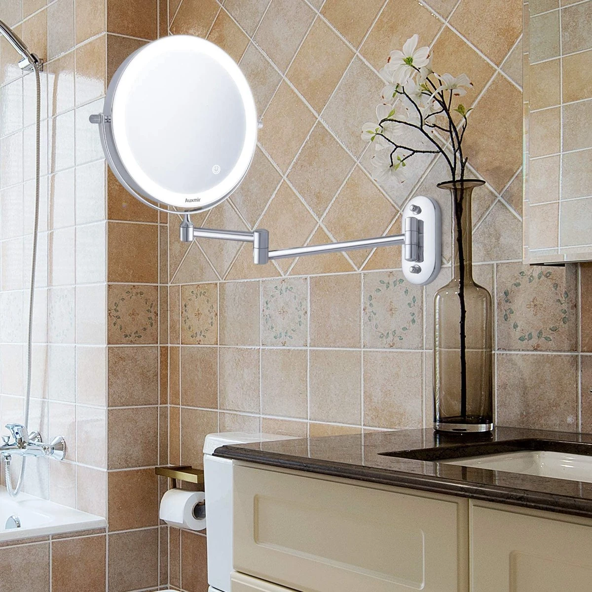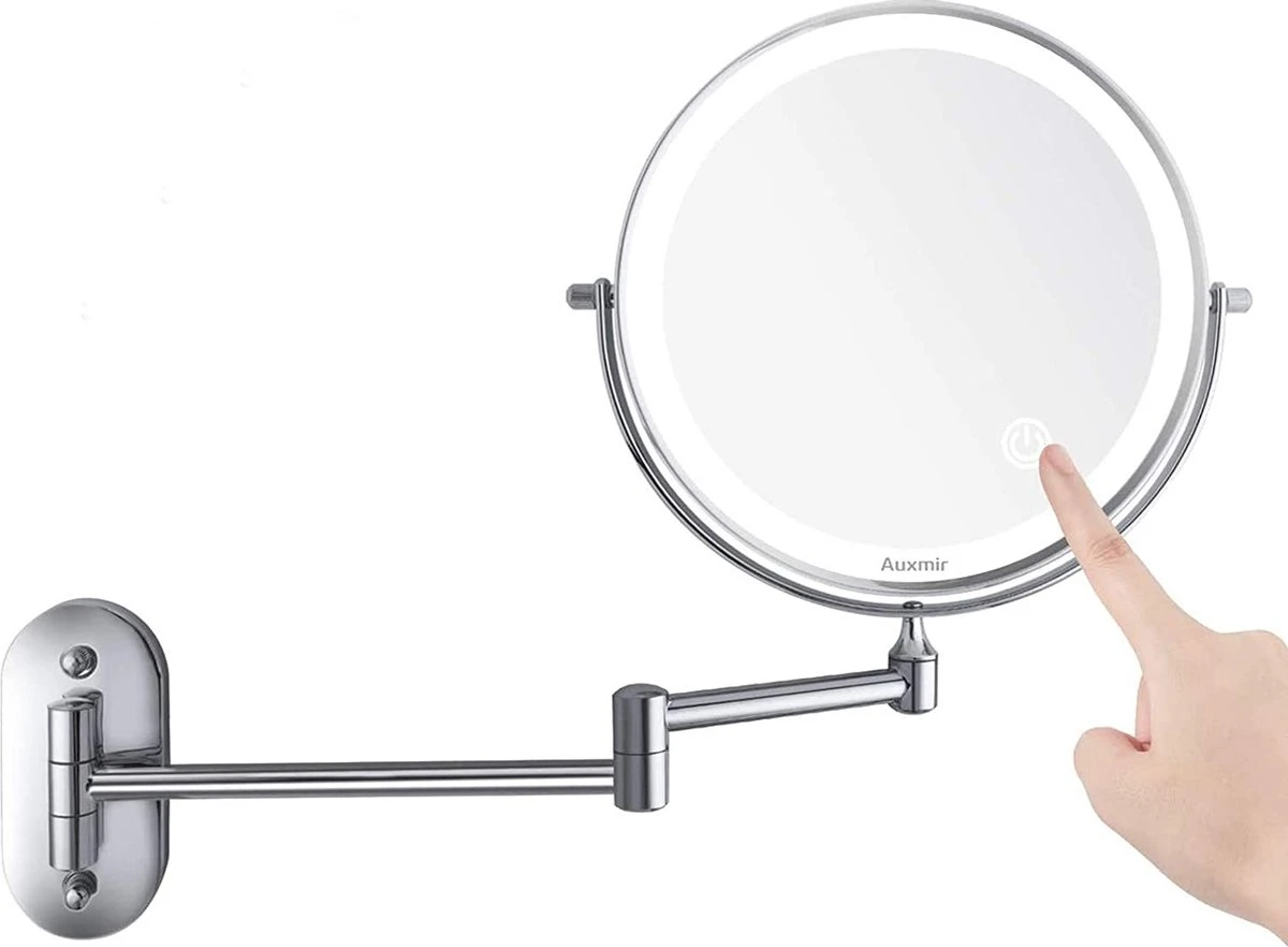 Auxmir Cosmetische Spiegel Met 1X / 10X Vergroting LED Verlichting, Dimbare Make-up Spiegel Met Touch Schakelaar USB Oplaadbare, Scheerspiegel 360 ° Draaibare Muurbeugel Voor Badkamer, Spa En Hotel