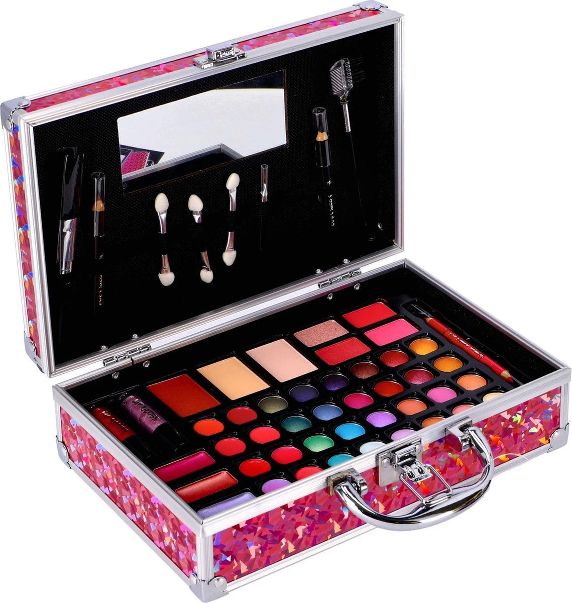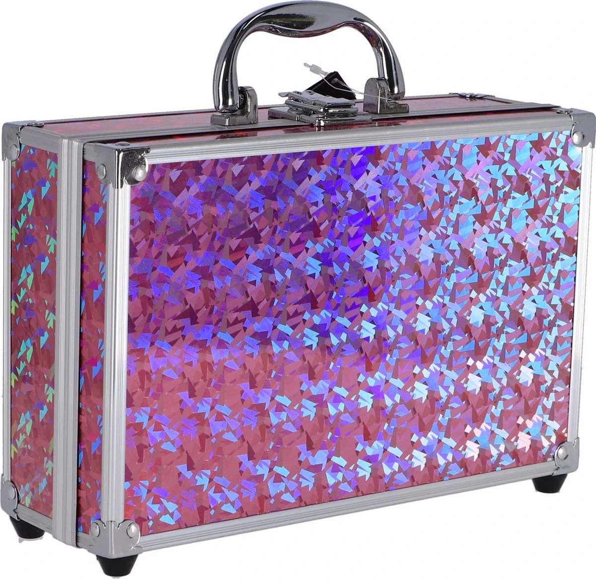 Een mooie roze make-up koffer met holografische buitenkant. De koffer bevat verscheidene kleuren oogschaduw, rouge en lipgloss. Ook vind je in dit koffertje verschillende soorten kwastjes voor het aanbrengen van make-up, en een spiegel aan de binnenkant van het deksel, zodat je altijd kunt zien waar je mee bezig bent. Geschikt voor kinderen vanaf 5 jaar.